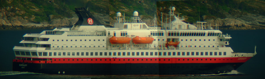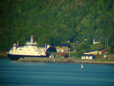 | Eines von vielen Schiffen der Hurtigrouten im Lekafjord | |||
