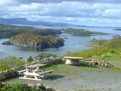 Die Insel Leka liegt 180 km nördlich von Trondheim und 150 km südlich vom Polarkreis (alles Luftlinie). Von Aschaffenburg sind es 2.200 Straßenkilometer bis hierher. Der Womo Stellplatz des Campingplatzes liegt auf einer Anhöhe von 50 m und hat einen Ausblick auf den Lekafjord, in dem auch die Hauptschifffahrtslinie verläuft. Hier ist großes Kino geboten. Zu einer kleinen Nebeninsel führt eine Brücke, unter der der Gezeitenstrom 2 mal hin und 2 mal her fließt, jeden Tag. Ein idealer Platz zum angeln. | ||