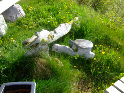| Kraftwerk der Lachszucht, groß wie ein Wohnblock. Ohne Diesel nichts. | Da gibt es immer was zu tun | .Rückenwirbel eines Wals, ca. 1m breit, nebst Rippe | |